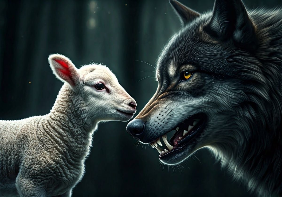 This image shows a lamb curiously touching noses with a wolf in a dark forest. The scene features fantasy realism, chaotic energy, and dramatic natural lighting with intricate details.