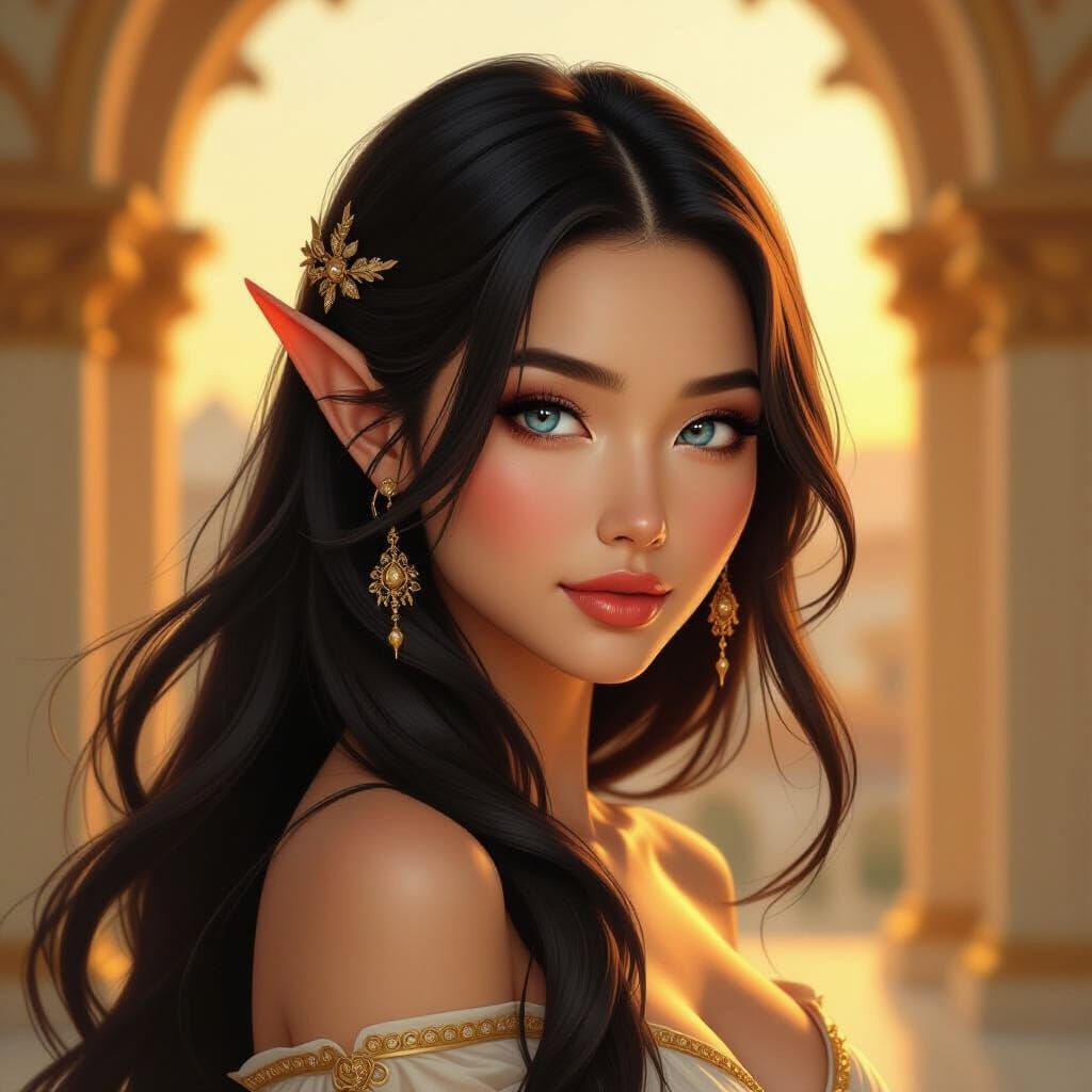 A beautiful Asian elf woman with flowing dark hair and blue eyes, rendered with realistic anatomy and soft lighting, inspired by Renaissance art and dynamic figure drawing.