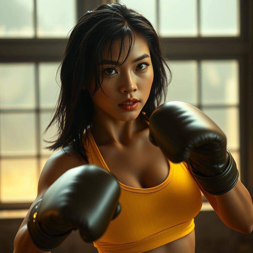 This image shows an Asian woman with caramel skin and wet hair in a boxing pose. The cinematic shot features warm golden lighting, film grain, and dramatic shadows, in a retro aesthetic.