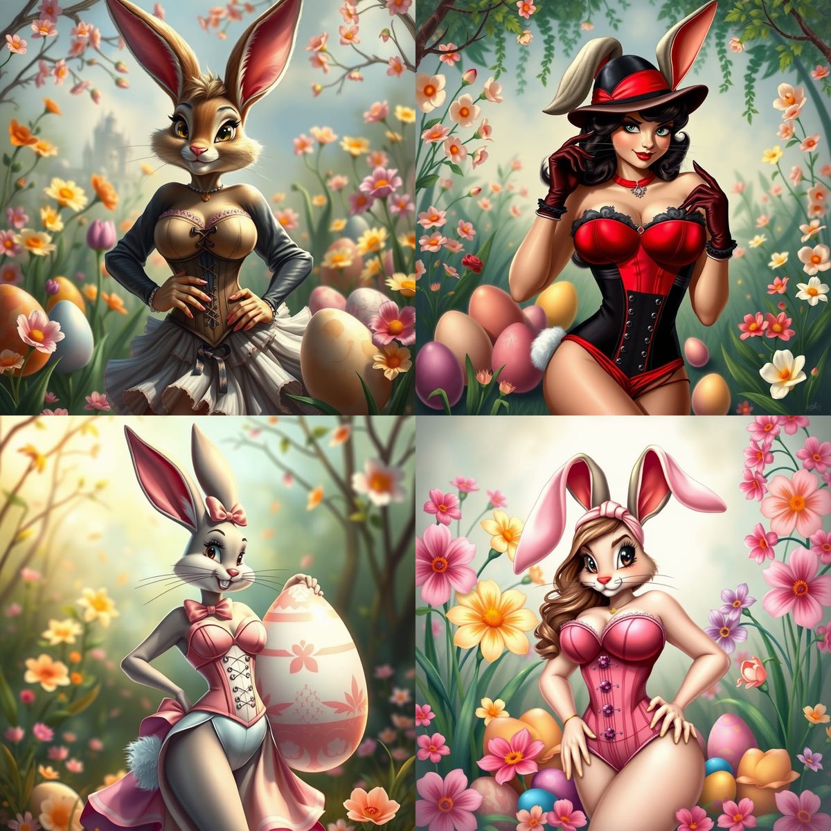 This image showcases a sensual Easter bunny in a vibrant Disney-inspired art style, rendered with realistic paint colors to create a captivating and playful scene.
