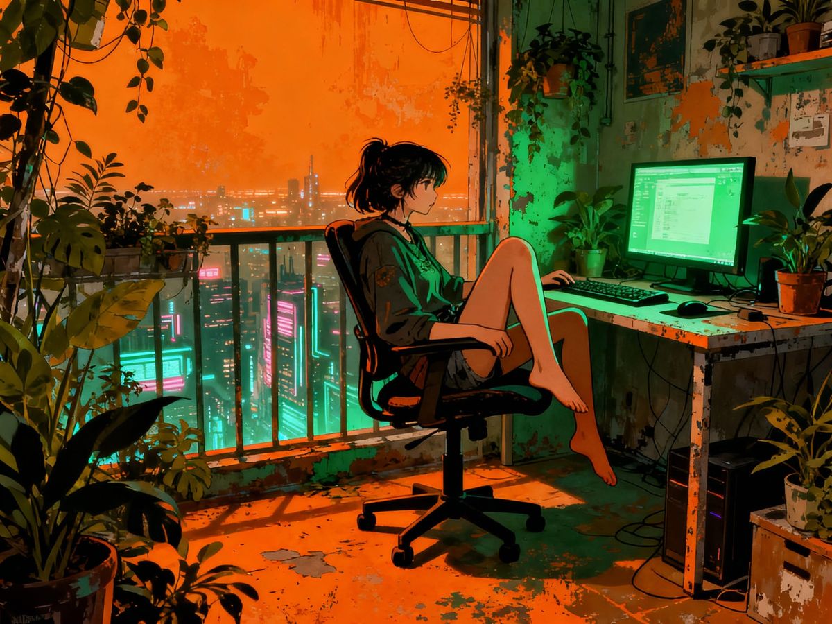 This image depicts a grunge-style scene of a young woman relaxing in an apartment overflowing with plants. She sits casually on a chair, working on a computer, with a vibrant cyberpunk city visible below. The artwork features a distinct grunge texture and a dominant orange and green color palette.