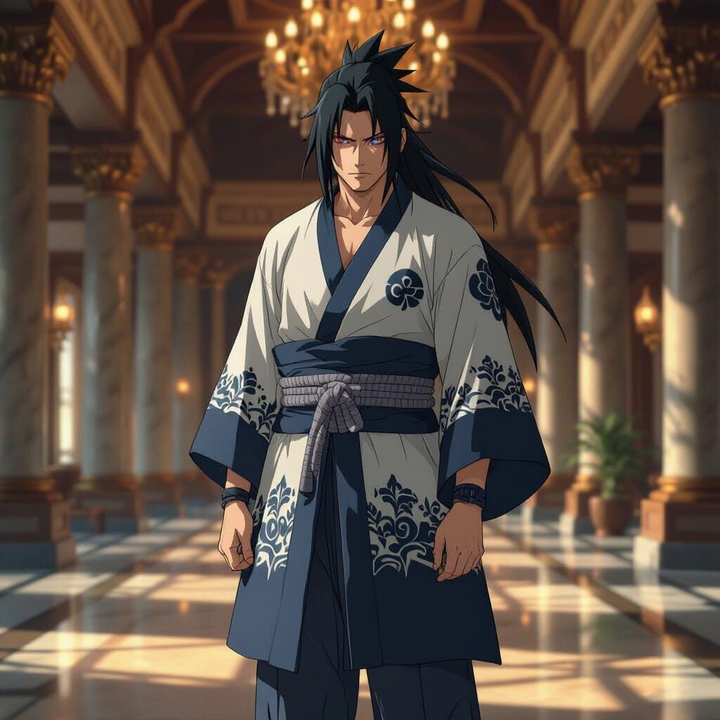 This detailed anime-style image shows Hashirama Senju in Sage Mode wearing beach pajamas in a castle lobby. Dramatic lighting highlights intricate textures, inspired by dynamic compositions and chiaroscuro effects.