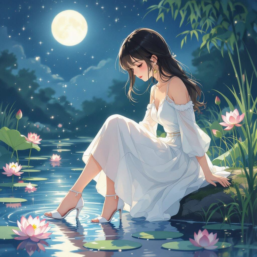 This image shows an anime girl in a white skirt and high heels by a lotus pond. She is depicted in a half-length portrait with soft moonlight and delicate watercolor effects.