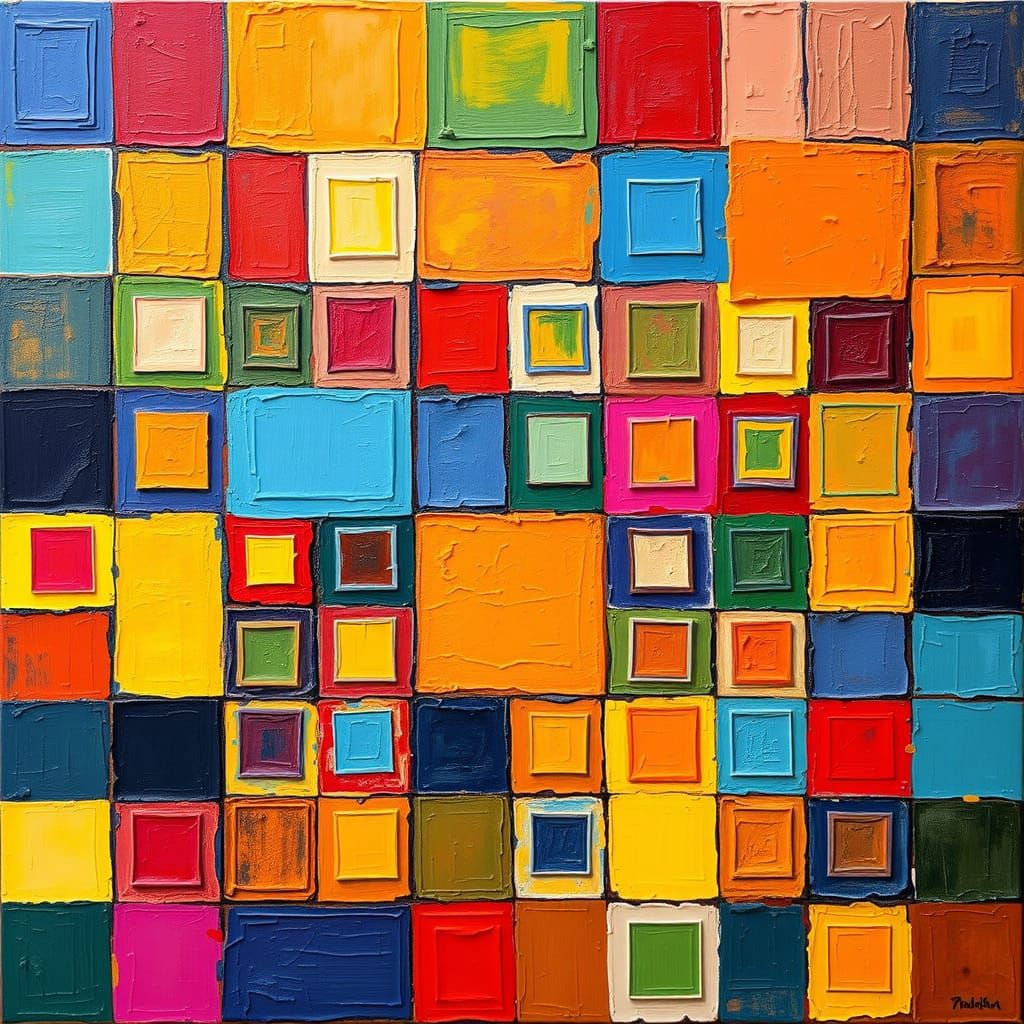 This dynamic oil painting features a kaleidoscope of colorful squares in a mesmerizing abstract composition, blending the rationality of geometric grids with the poetic intensity of color interactions.