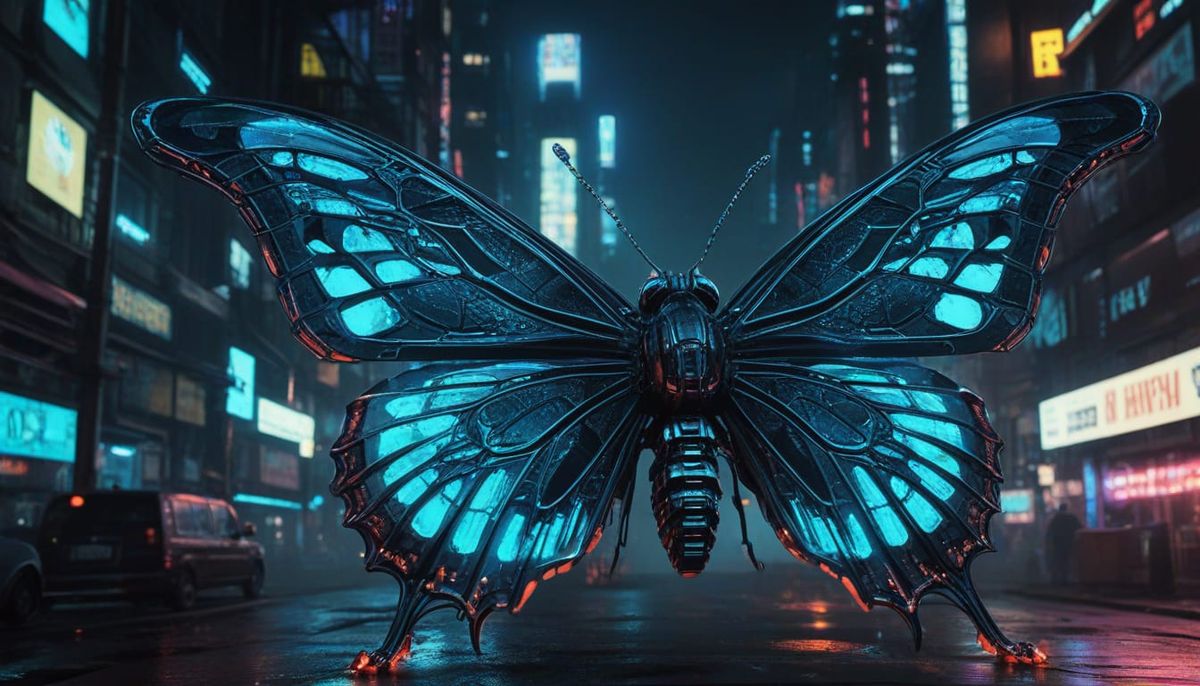 This image shows a cyborg butterfly with mechanical wings perched on a metallic flower. The artwork is in a cyberpunk aesthetic, featuring neon lights, intricate mechanics, and a dark cityscape.