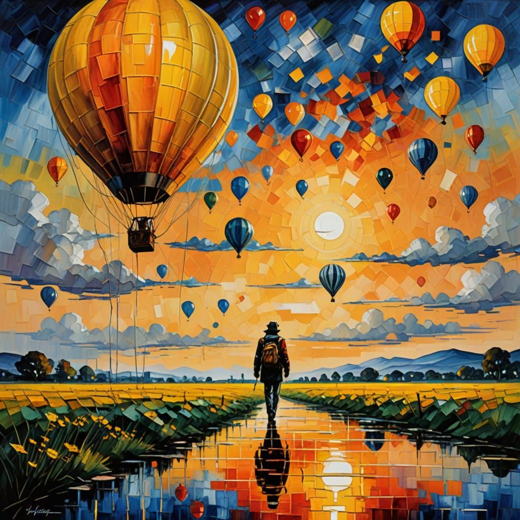 This image features a balloon floating in a mellow yellow and orange sky, rendered in a style inspired by geometric abstraction and expressive brushwork.