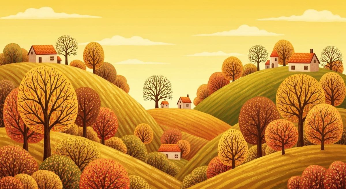 This image depicts a charming autumnal village with rolling hills and colorful trees in a folk-art style. Houses with orange roofs sit under a soft yellow sky, creating a serene atmosphere.