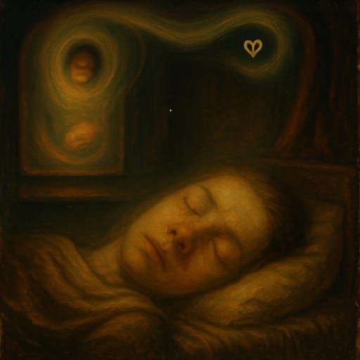 Every time I awaken from sleep, I count and reaffirm all the things that can never be taken away from me, and the first is always love. Intensely surreal imagery and atmosphere, hypnagogia, liminal, a mixture of 20th century Surrealist influences, Rembrandt lighting, rich textures, oil on canvas.