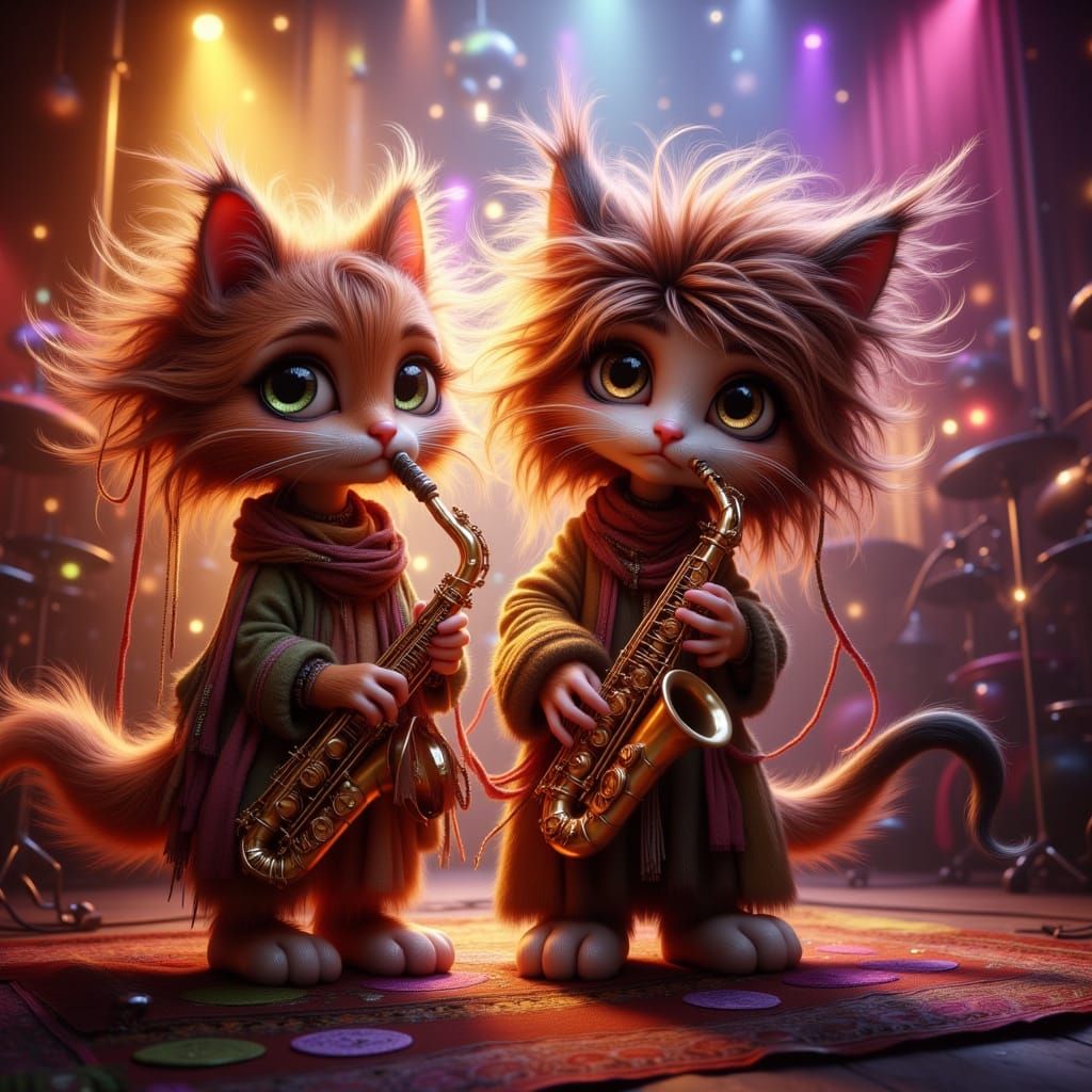 This image shows a cat and dog playing saxophones in a jazz band on a vibrant stage, rendered in a fantastical airbrush style with luminous highlights and rich colors.