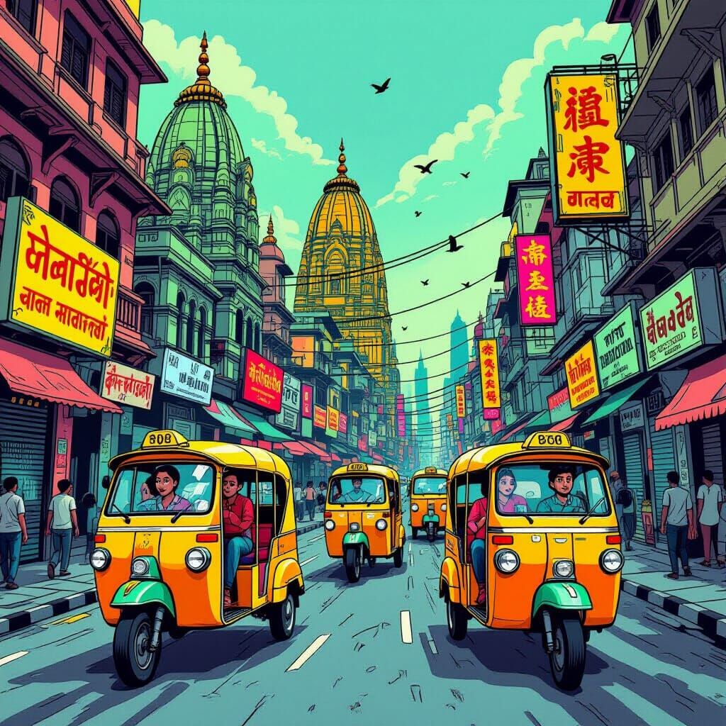 A vibrant cartoon street scene in Mumbai, featuring auto-rickshaws, ancient temples, and Bollywood billboards. The characters have exaggerated features and bold outlines, in a classic 2D animation style.