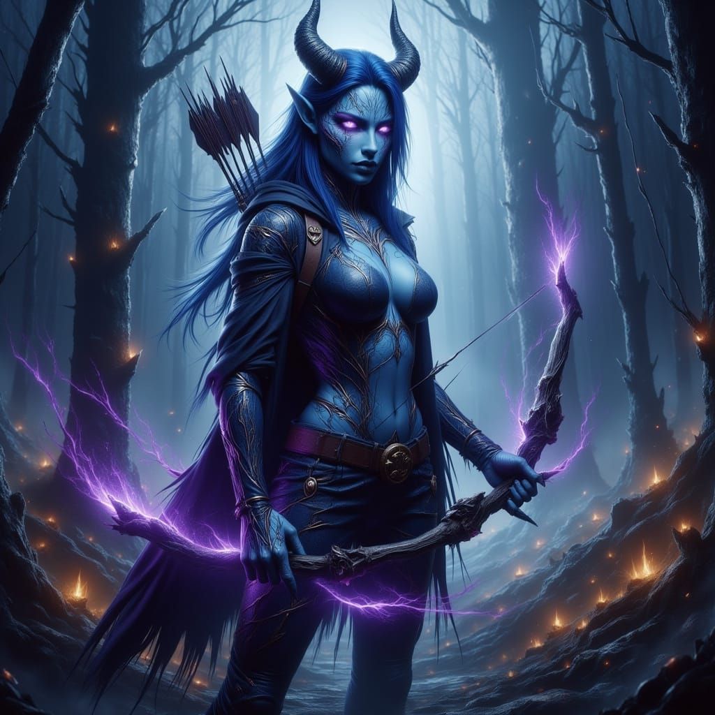 This image shows a striking female tiefling ranger standing on a forest hilltop path, with vibrant purple and yellow hues illuminating her detailed features. Her robin's egg blue skin and navy blue hair are accentuated by the dynamic lighting, while her black horns and white luminous eyes add to her myst...