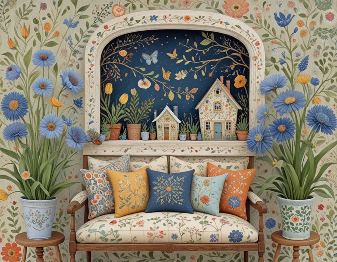 This image showcases a cozy home rendered with meticulous detail. The artwork features intricate, entangled patterns creating a deeply detailed and artistic visual experience.