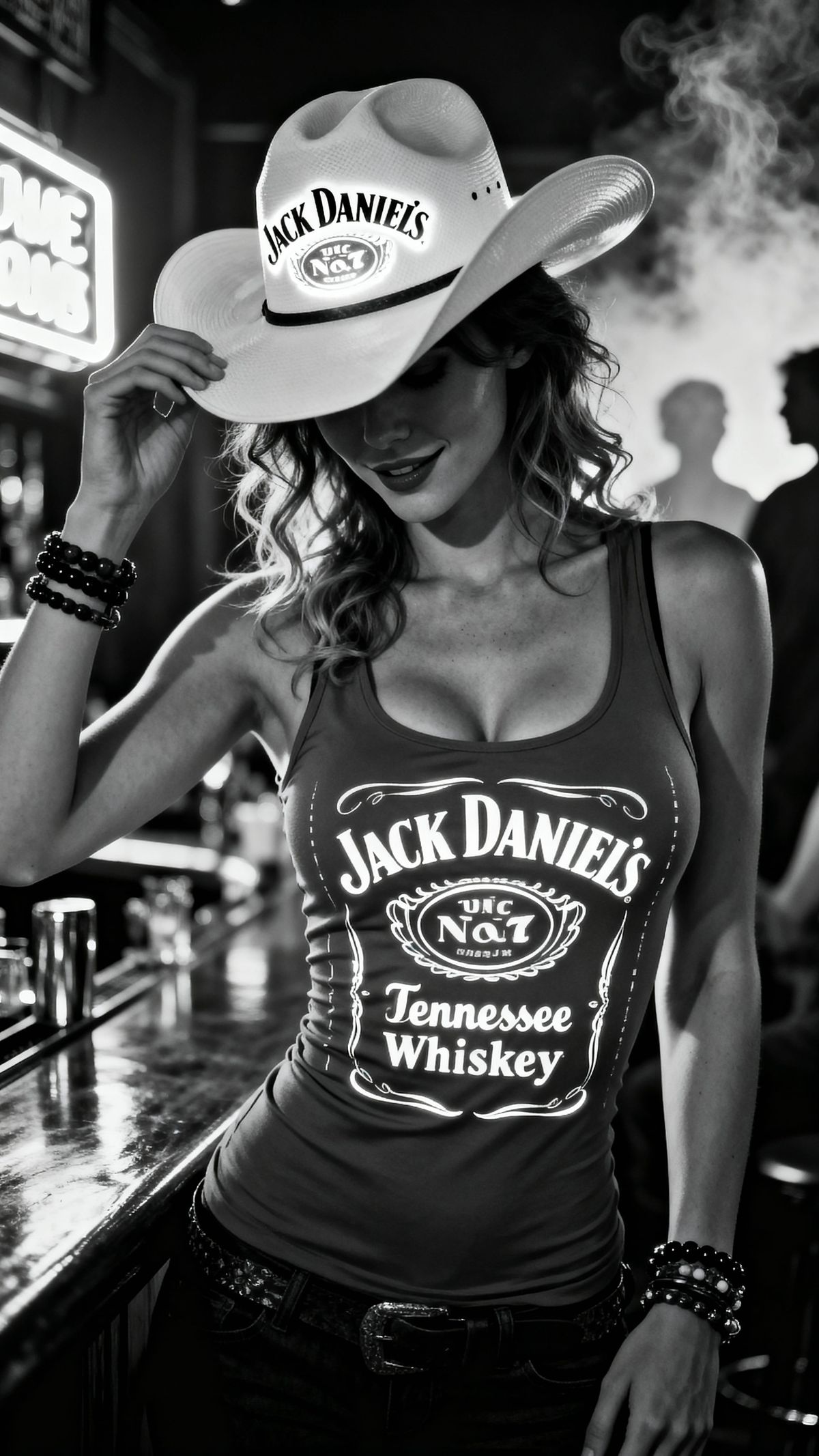 A striking woman in a cowboy hat stands out in the neon-lit night. Her form is highlighted by monochrome tones and a tilt-shift effect, creating deep 3D visual effects.