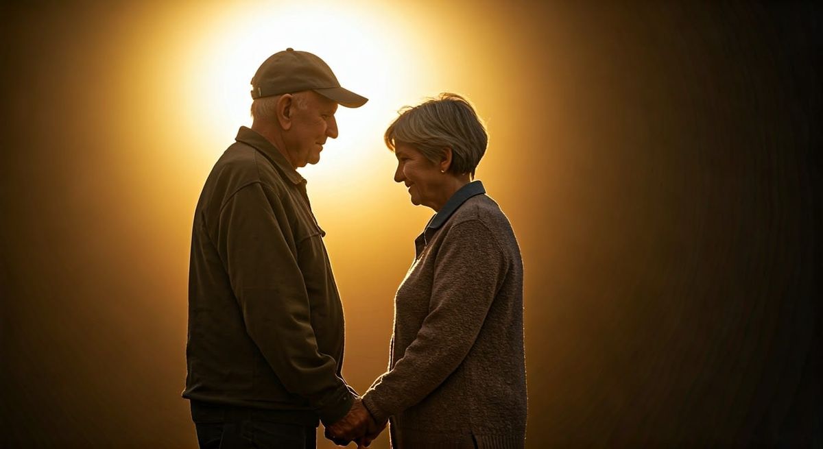 This heartwarming image captures a tender moment between two elderly individuals, bathed in warm golden light and soft focus, exuding a sense of serene intimacy and joyful love.