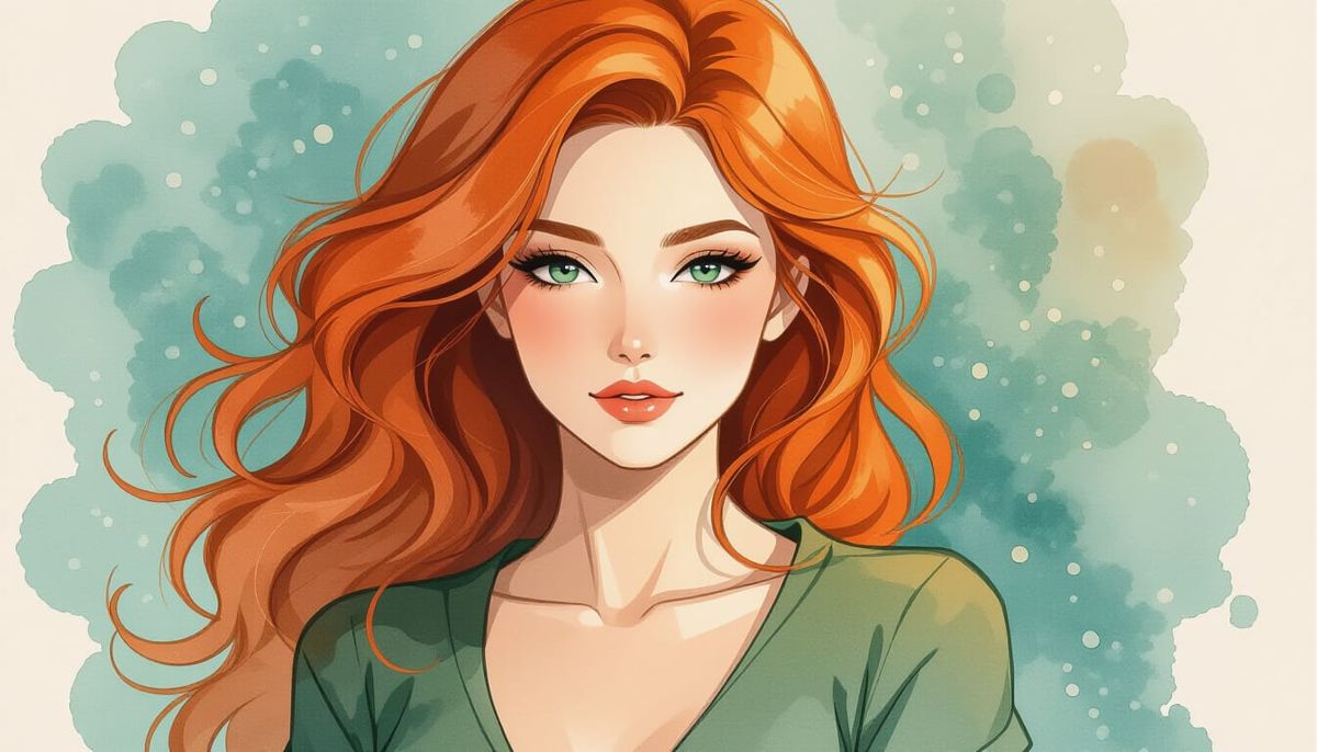 A digital sketch of a beautiful woman with auburn hair and green eyes. The artwork features dynamic curves and a triadic color scheme with elegant brush strokes, creating a dreamy, ethereal feel.