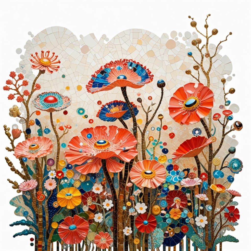 This image shows vibrant coral gardens in a tropical lagoon during sunset. The background is a mosaic of brushstrokes, evoking symbolic, layered, and surreal pop art aesthetics.