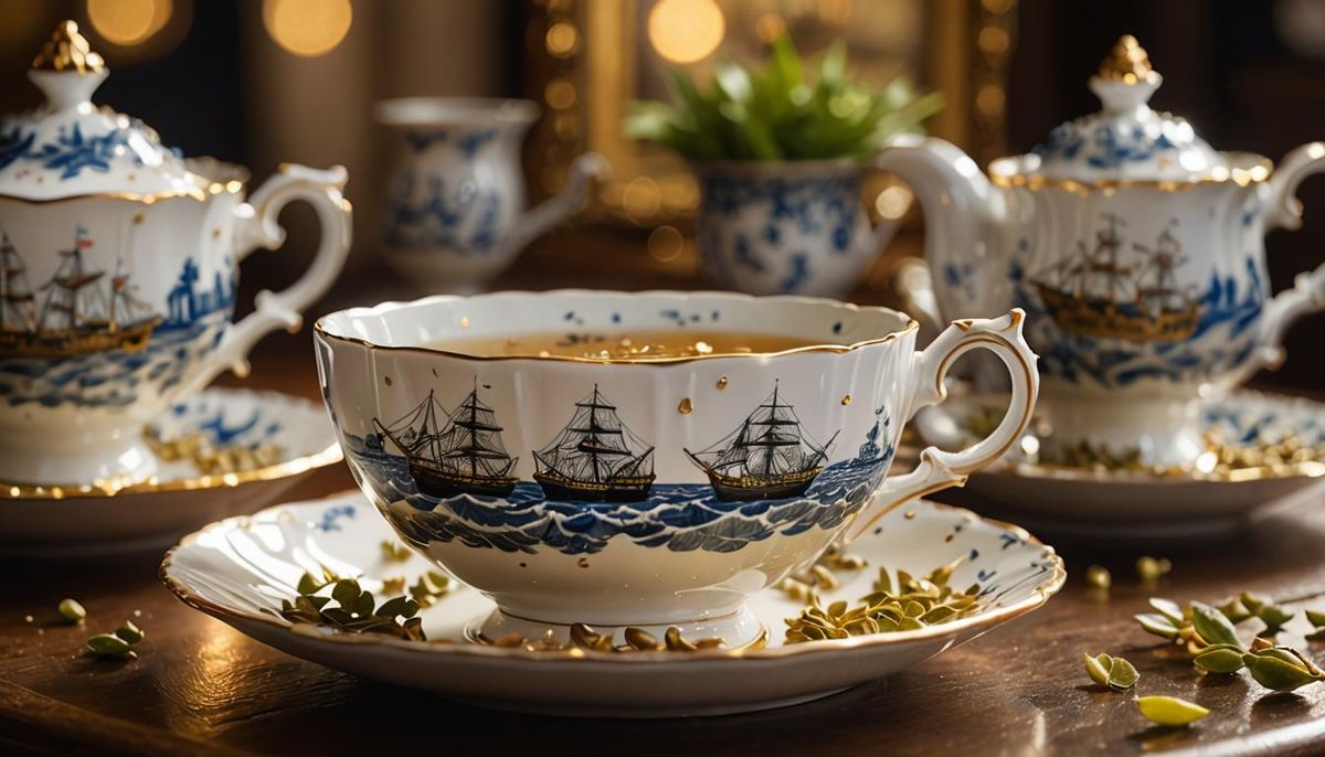 This enchanting image depicts a low-angle shot of two frigates navigating through tea leaves inside a teacup, set against a warm golden glow with intricate china patterns and water droplets on the rim, creating a nautical atmosphere of incredible detail and realistic textures.