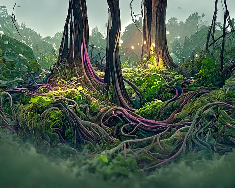 A digital artwork showing a tangled, lush forest with long roots and strong lianas. The image is highly detailed with beautiful lighting, reminiscent of romanticism.
