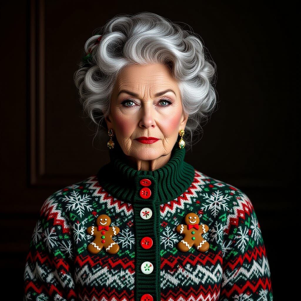 This hyperrealistic portrait captures an elderly Victorian woman in a striking, elaborately knitted Christmas sweater featuring clashing geometric patterns and gingerbread men buttons. Photographed with dramatic lighting.