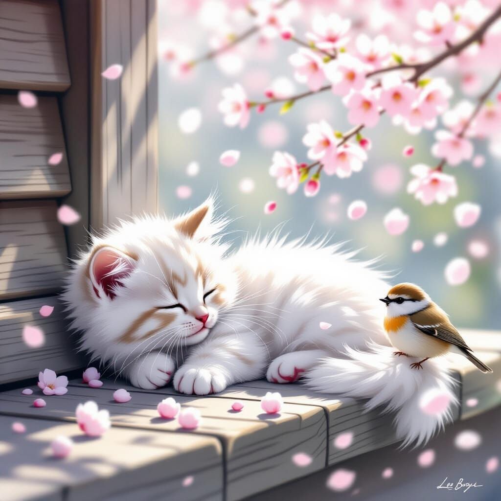 This image shows a fluffy white kitten and a small bird on a wooden porch, with cherry blossoms falling. Rendered in an airy watercolor style with subtle washes.