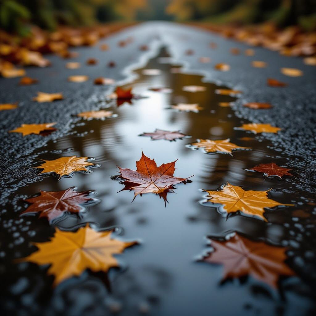 A close-up, realistic photograph captures brown and golden autumn leaves floating in a shallow rain puddle on wet pavement, reflecting a calm, earthy mood.