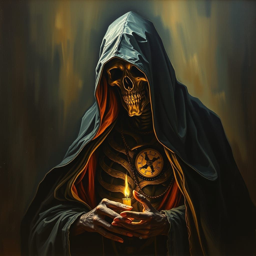This oil painting presents a mysterious, cloaked figure in a dark, symbolic scene. Inspired by decadent symbolist art, it uses dramatic lighting and rich detail to evoke a profound, unsettling mood.