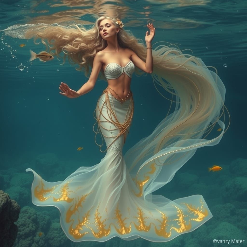 A graceful sea goddess with long blonde hair swims underwater. She wears ornate white and gold mermaid attire, surrounded by colorful fish and bubbles, in a surreal and mystical scene.