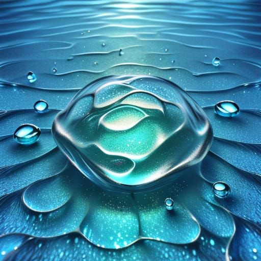 A shimmering macro photograph of water molecules on a surface. The dreamlike digital art uses soft blue lighting and a pastel color scheme to create a surreal, 3D rendered effect.
