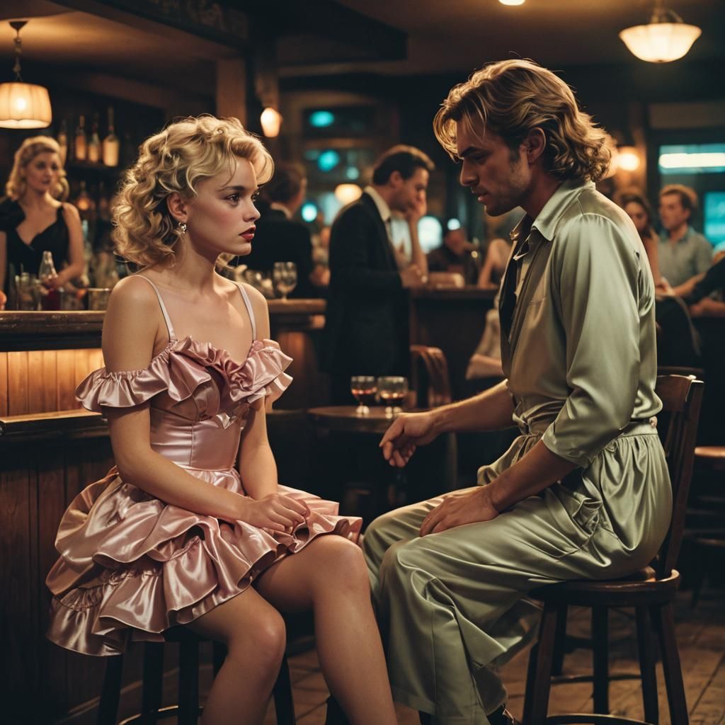Cinematic film still of a young blonde man in a ruffled dress and heels, seated at a bar. Features dramatic lighting, a warm palette, and a soft focus, evoking an intimate and moody atmosphere.