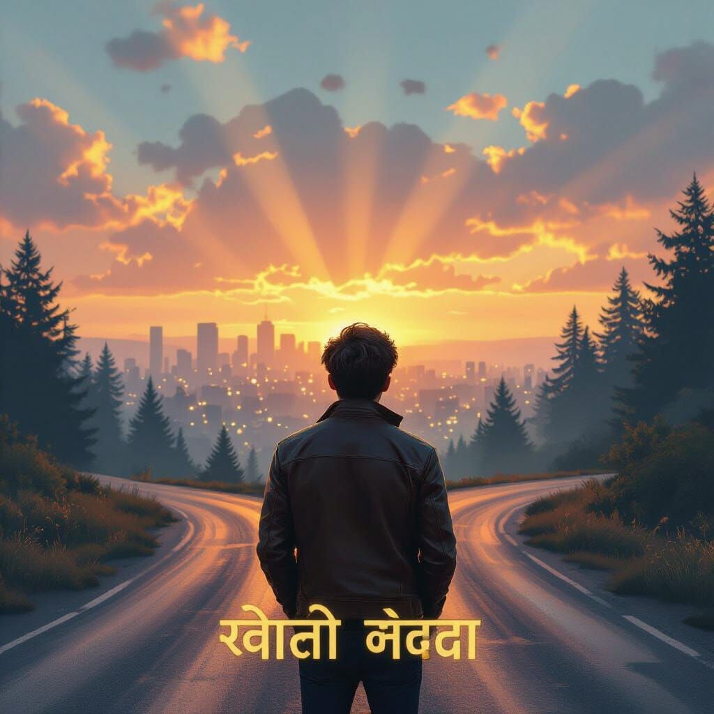 A contemplative image of a man at a crossroads, with one path leading to a vibrant city and the other into a peaceful forest, in a retro science fiction style.