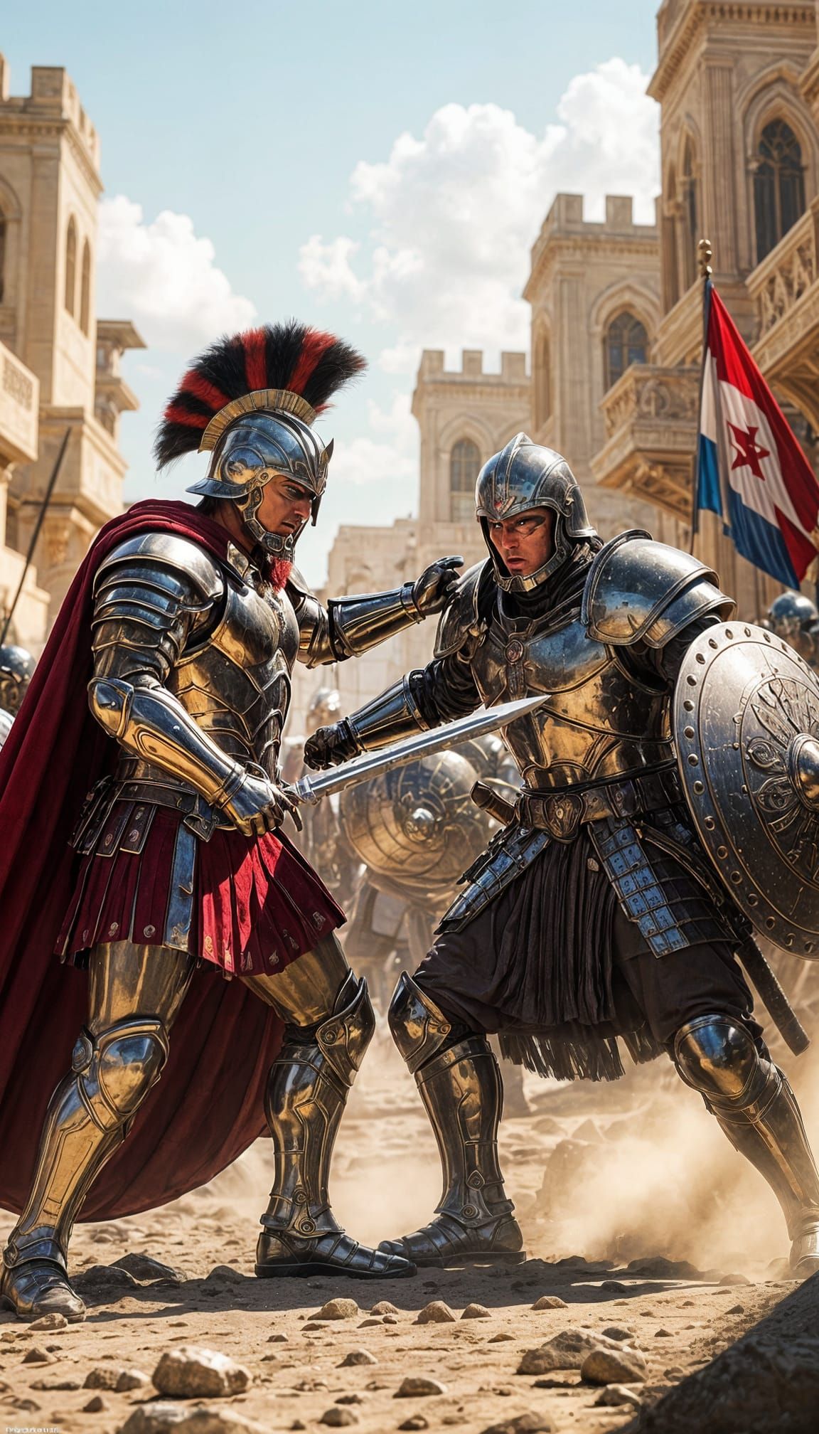 A futuristic cinematic animation shows a muscular Spartan warrior in shiny white gold armor fighting a grey gold crusader from the Romanian army near Damascus. The image features army logos and a griffin soaring through a nebula.