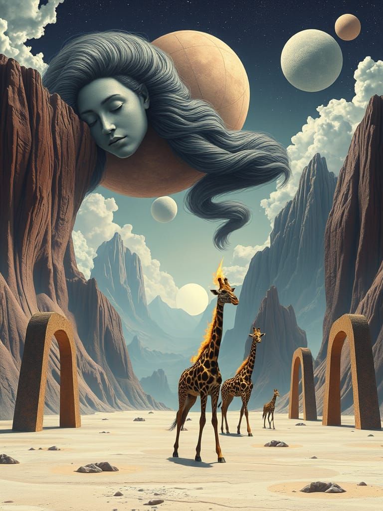 This image shows a surreal landscape featuring mountains shaped like sleeping heads. Rivers of hair flow upwards into geometric shapes, while giraffes traverse melting archways in a bizarre, optical illusion.