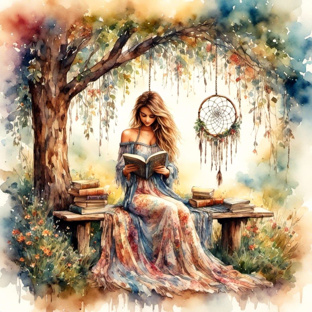 <lora:Antique Watercolor:1.0> <lora:3D HD Portraits:1.0> <lora:Boho Ladies:1.0> beautiful bohemian hippie woman reading a book under a tall beautiful blooming tree, magical mystical enchanted antique watercolor vintage country style rich colors dreamy"