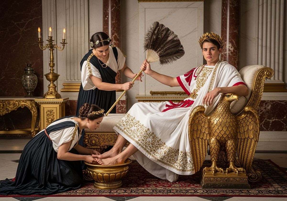 This image shows a young Roman Emperor lounging on an eagle-shaped chaise longue in a palace. Servants attend to him in this scene reminiscent of Baroque and Neoclassical paintings. Captured with sharp focus and natural lighting.