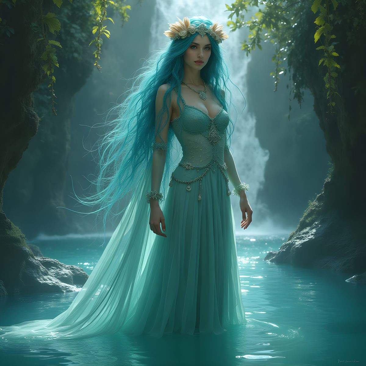 A striking picture of a water nymph with aquamarine eyes and sapphire hair. She wears a seashell crown and gown of seafoam, standing by a lagoon in a gothic art style.