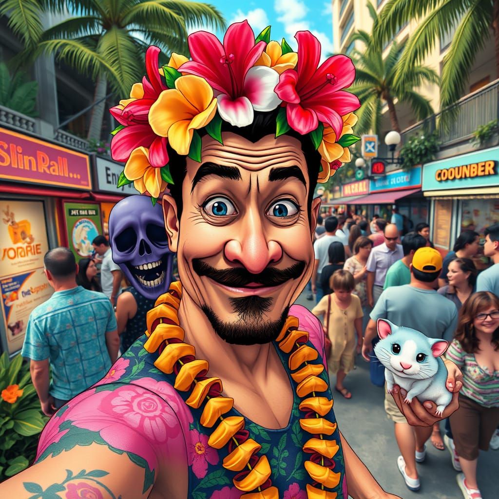 This image shows a surreal Hawaiian man with a flower crown taking a selfie in a busy garden. The scene includes a vampire ghost and hamster, rendered with vibrant, playful colors in a surreal style.