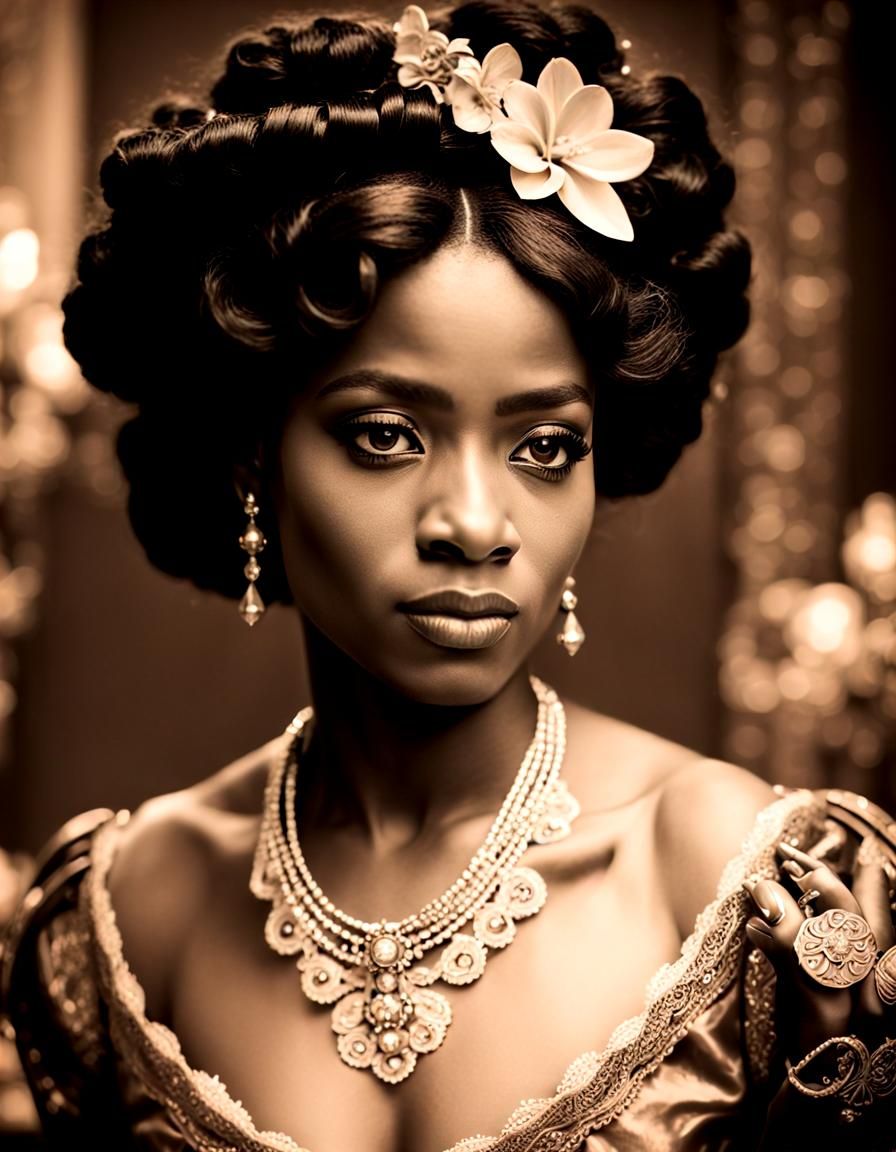 This image shows a sepia-toned portrait of a Black woman in Victorian-era attire, set against ornate décor. The aesthetic evokes a sense of nostalgia reminiscent of 1900s photorealism.