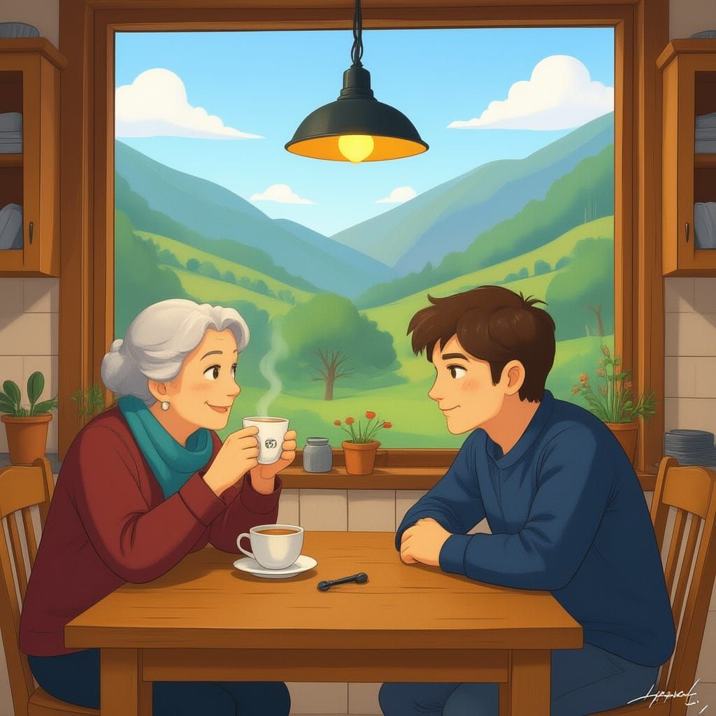 This whimsical digital illustration depicts a warm, intimate kitchen scene where an elderly woman and a young man share tea. Soft lighting contrasts with cool window light, highlighting a key on the table.
