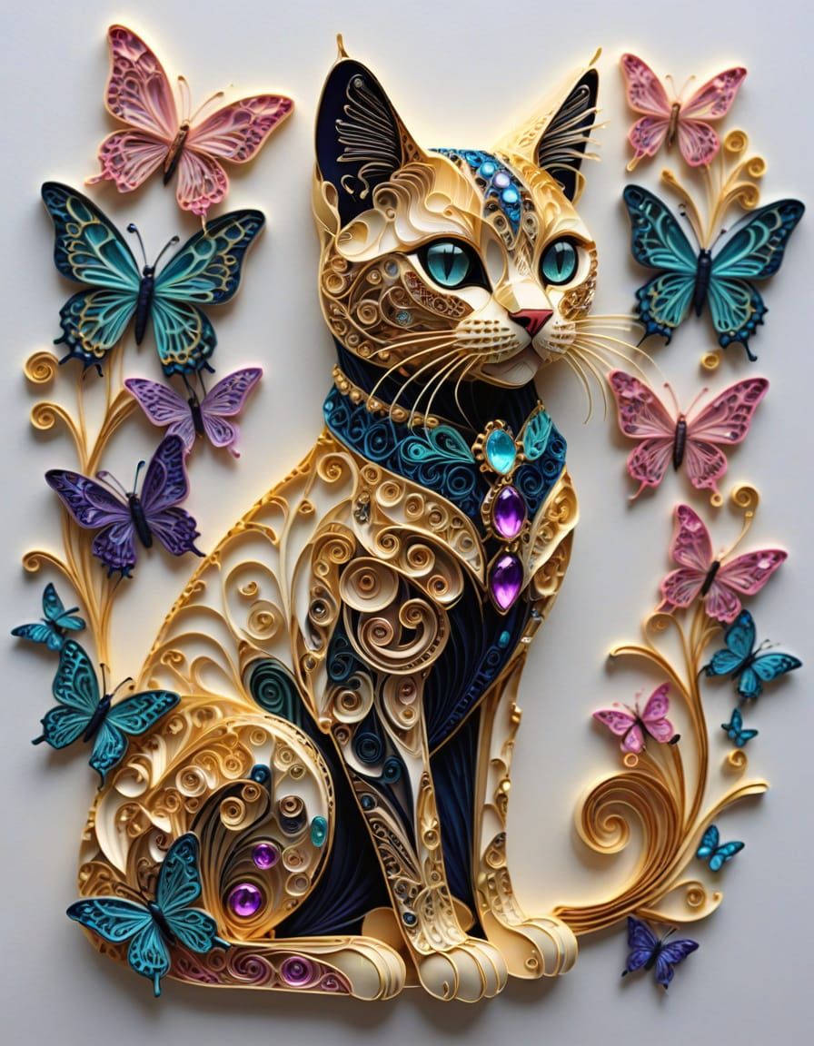 This exquisite image depicts a majestic golden cat surrounded by a kaleidoscope of gemstones and delicate, glowing butterflies, showcasing intricate quilled and filigree details in a highly detailed and sharp composition.