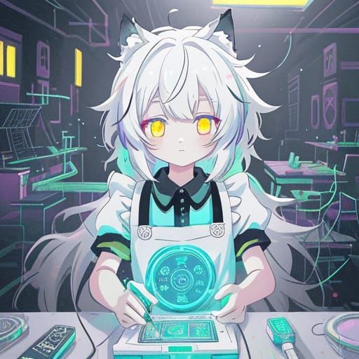 This image shows a chibi-style wolf girl with white hair and cybernetic enhancements. She is wearing a tattered apron and the artwork features pastel colors, neon circuits and warm lighting in an anime style.