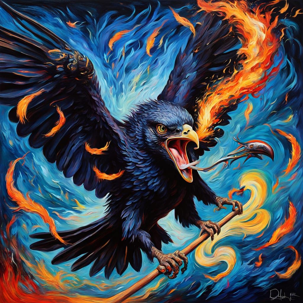 A vibrant oil painting depicting Ozzy Osbourne biting a bat that is transforming into a black phoenix. This image showcases bold brushstrokes, realistic textures, and symbolic surrealism in an expressionist style.