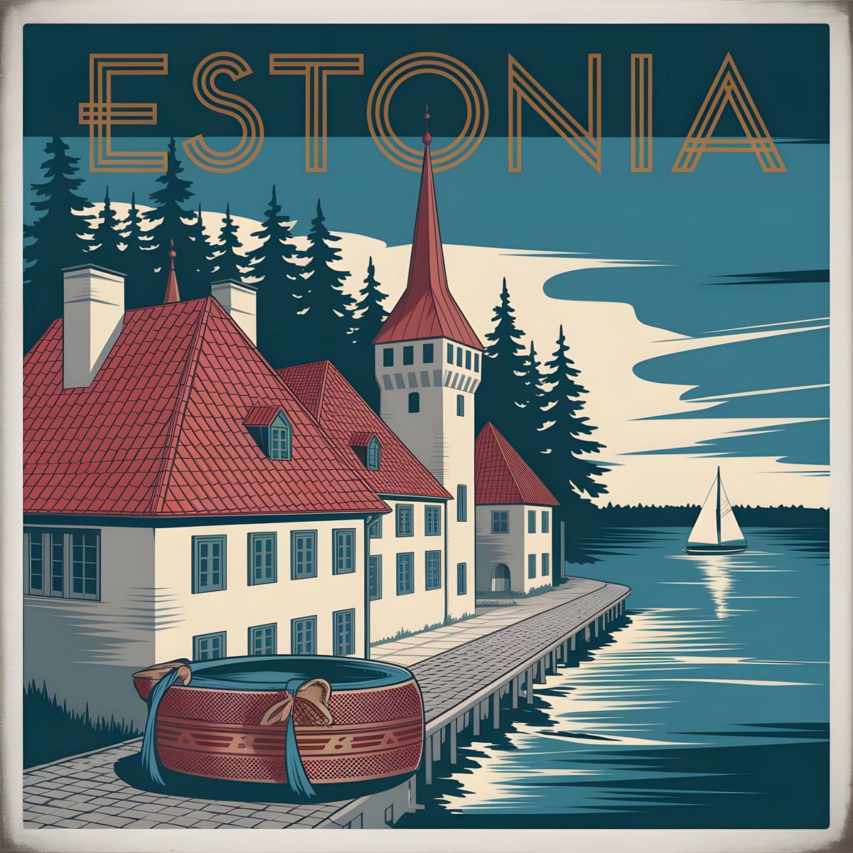 A cool-toned vintage-style poster evoking Estonia’s old-world charm and northern serenity. The red-roofed towers of Tallinn rise above cobbled streets, with pine forests stretching inland and the shimmering Baltic Sea beyond. In the foreground, a traditional woven sash and sailboat complete this folklore-rich, atmospheric scene.
