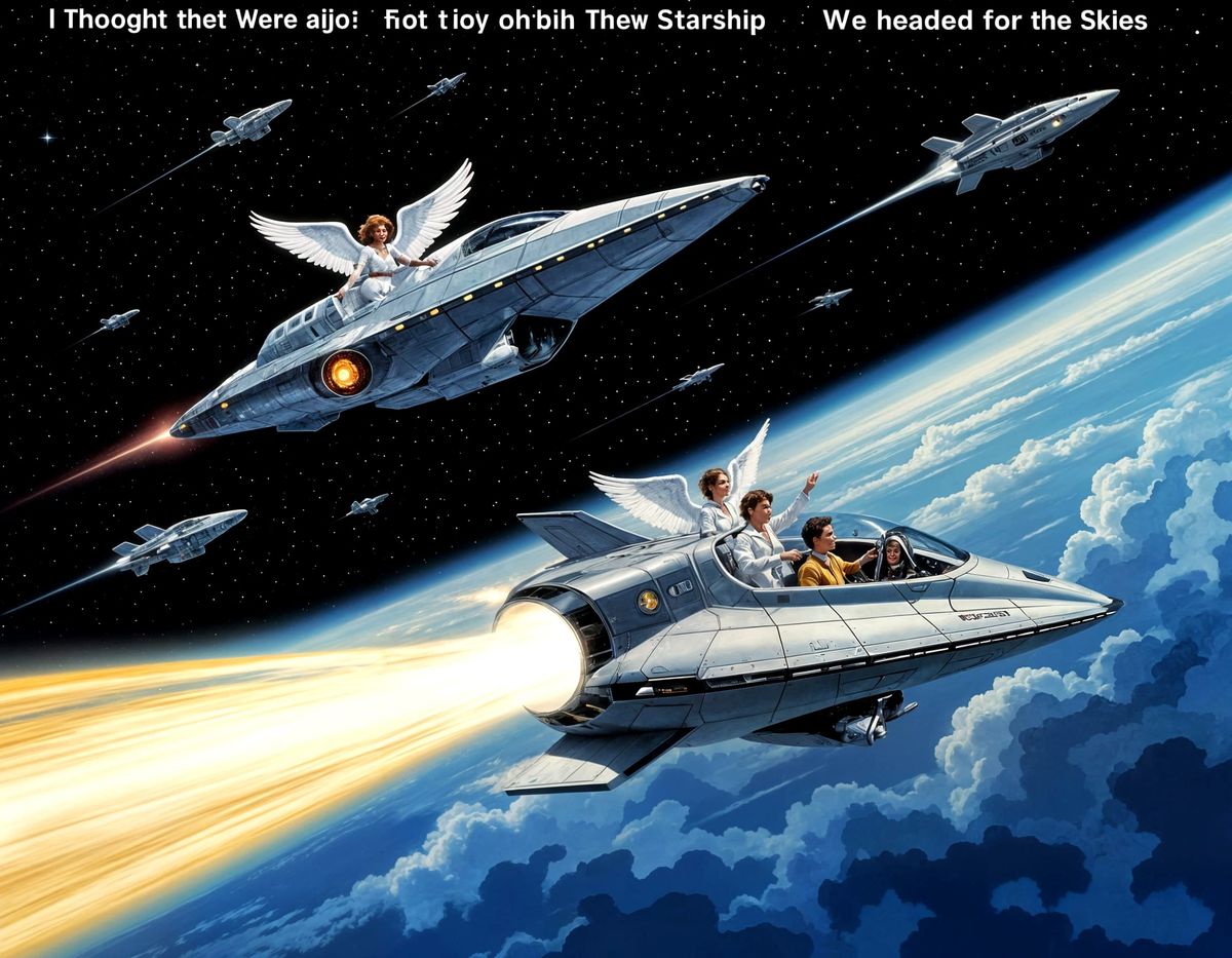 This image depicts a surreal scene of figures ascending into the sky on a starship. Evokes a sense of wonder and otherworldly travel, as if embarking on an interstellar journey.