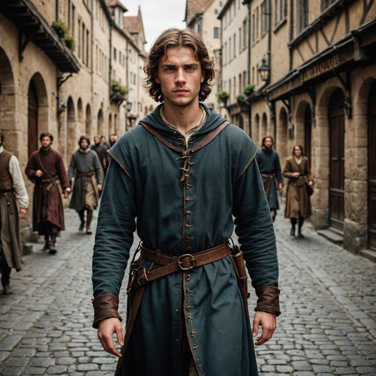 This image shows a young man walking down a medieval street. He looks nervous, glancing around as if expecting to be accosted by someone.