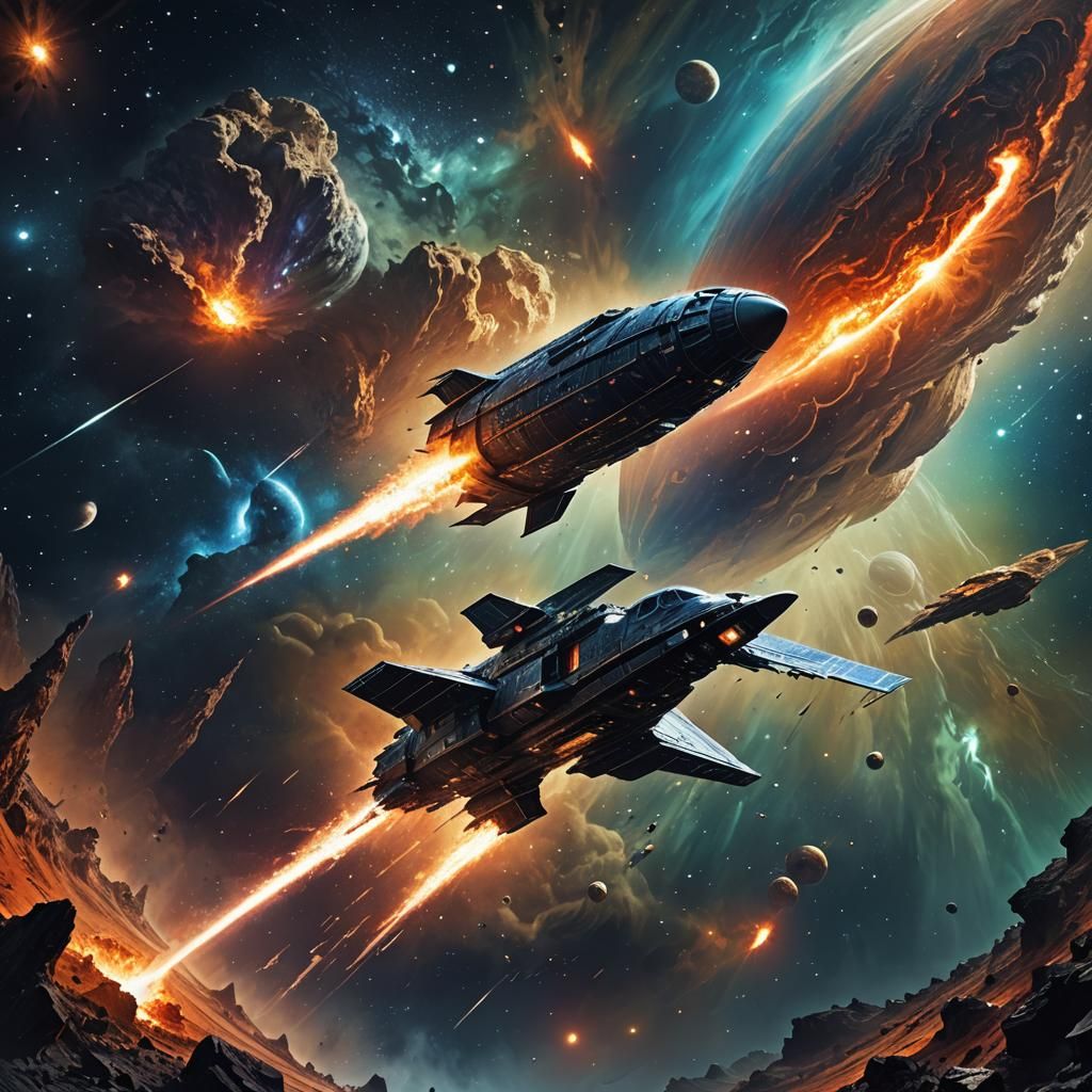This image shows a spacecraft ascending through a comet's tail near Jupiter. A cyclopean storm gazes from the planet in this vibrant digital painting, a detailed matte work with complementary colors and prismatic lights.