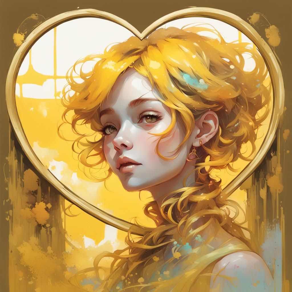 A digital painting of a woman's face, framed in a heart shape, expressing satisfaction. The artwork features a kawaii manga style and a yellow color scheme, reminiscent of rococo art.