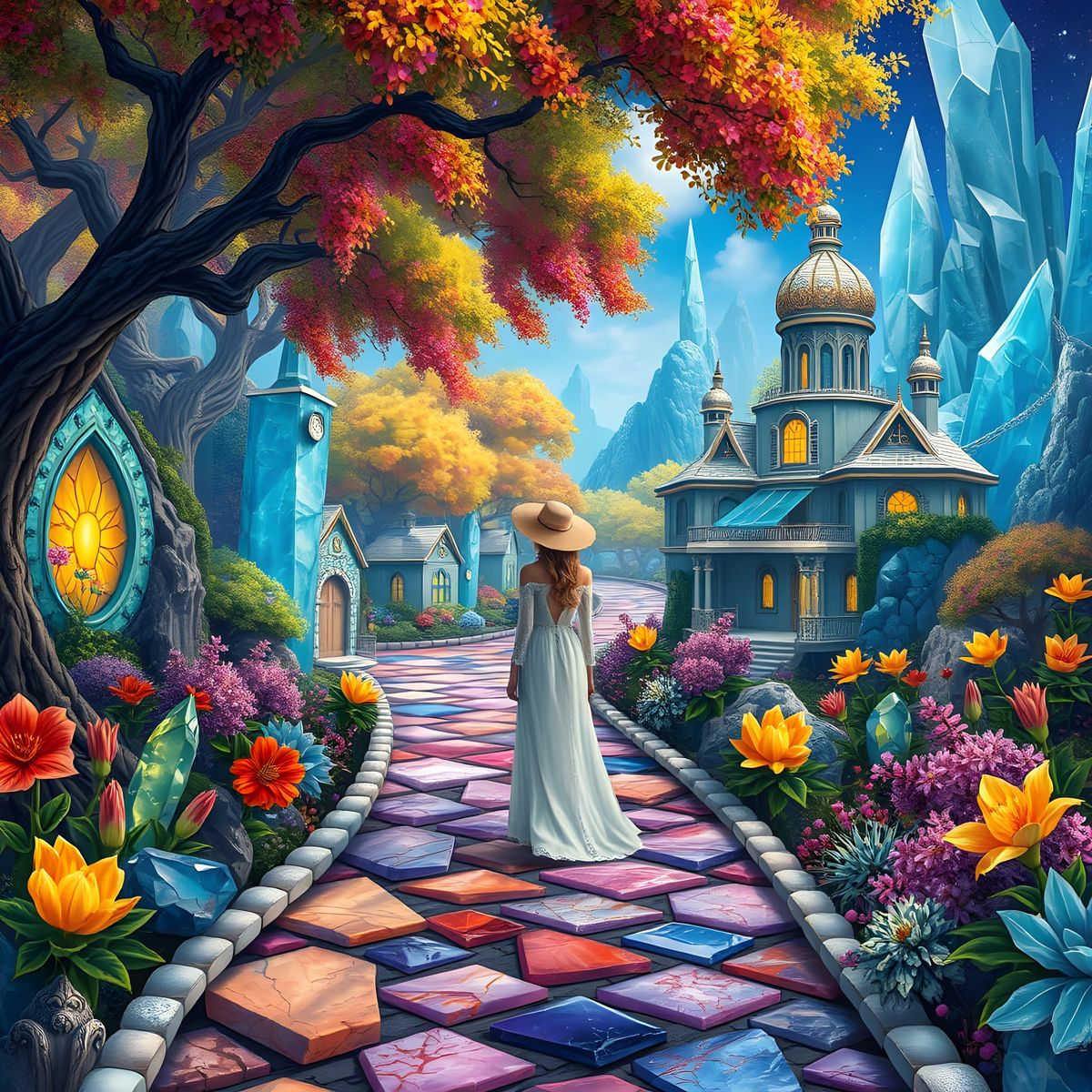 A whimsical landscape featuring crystal houses and bridges adorned with gems, surrounded by vibrant trees and flowers. The image captures a fantastical, dreamlike setting.