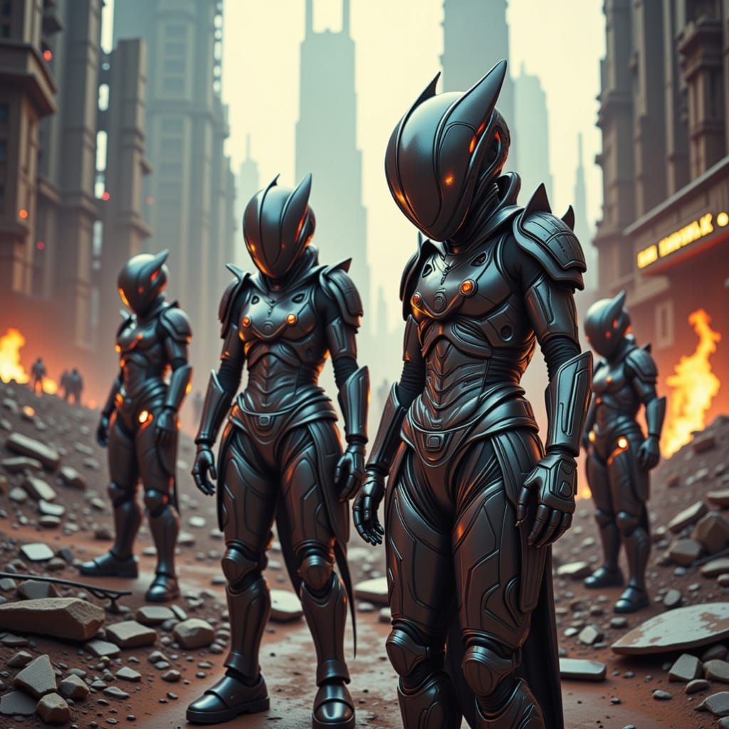 This image shows futuristic Shonbi warriors guarding a ruined city. The film still aesthetic emphasizes the desolate scene with cinematic lighting, subtle film grain, and a worn, metallic appearance.