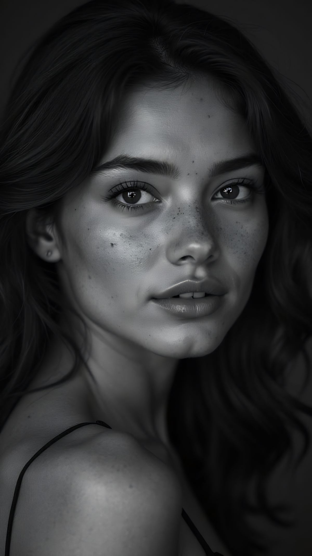 A striking picture of a black and white art portrait featuring shadow play and dramatic hues. The hyperdetailed skin, freckles, and visible pores are captured in 8k resolution.