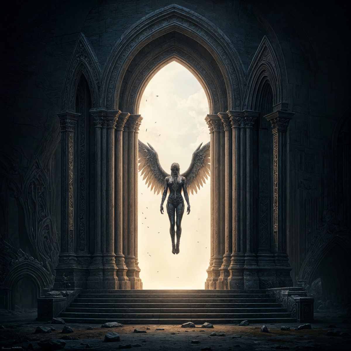This image shows two stone columns covered in glowing runes, framing a portal. Inside the portal is a winged figure suspended in mid-air, rendered as a dramatic digital painting.